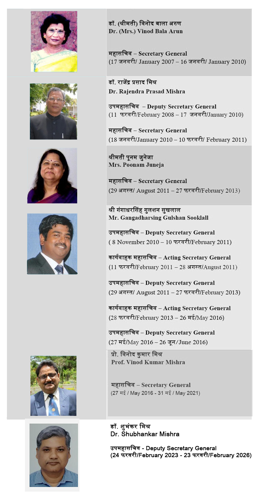 Pursuant to the Sections 11 and 12 of the World Hindi Secretariat Act of 2002,the following officials have assumed the post of Secretary General and Deputy Secretary General of the World Hindi Secretariat since its official functioning till date.