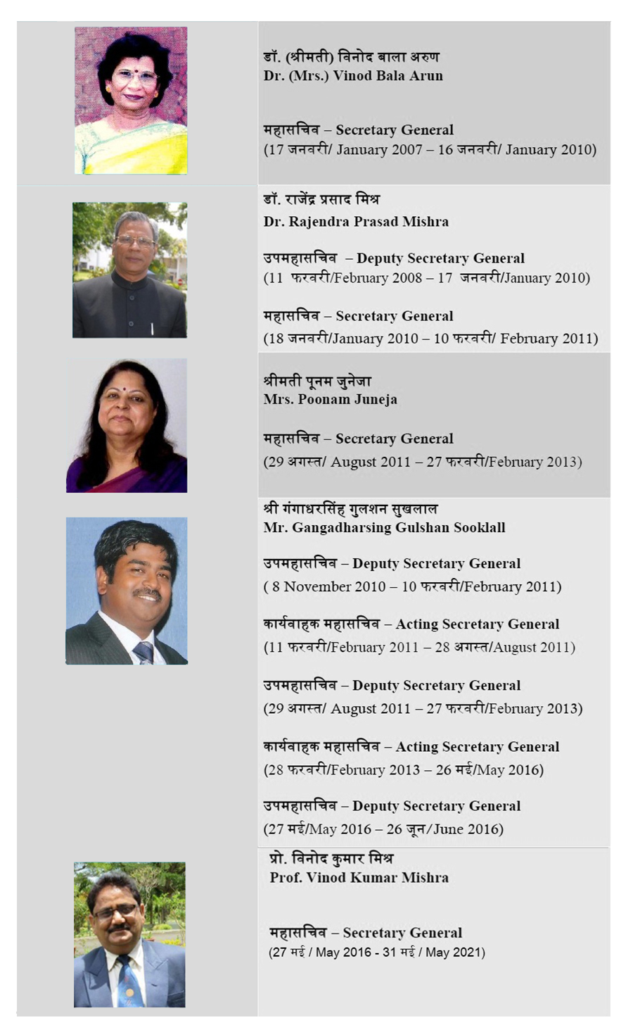 Pursuant to the Sections 11 and 12 of the World Hindi Secretariat Act of 2002,the following officials have assumed the post of Secretary General and Deputy Secretary General of the World Hindi Secretariat since its official functioning till date.